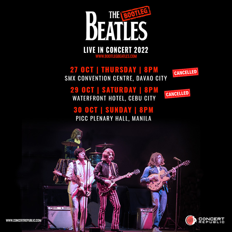 “Concert Republic regretfully announces, The Bootleg Beatles concerts scheduled for SMX Convention Center, Davao, Thursday 27th October & Waterfront City Hotel & Casino, Cebu, Saturday 29th October 2022 have been cancelled, despite the best efforts of Concert Republic and The Bootleg Beatles for the concerts to happen. The Bootleg Beatles have issued the following statement: